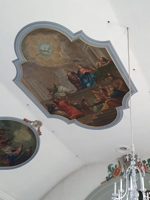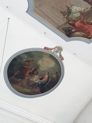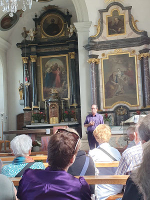 Adalbert Bächler, pensionierter Lehrer aus Bösingen, hat uns in der Kirche Bösingen anhand von zwei Beispielen die Fresken an der Kirchendecke vorgestellt.